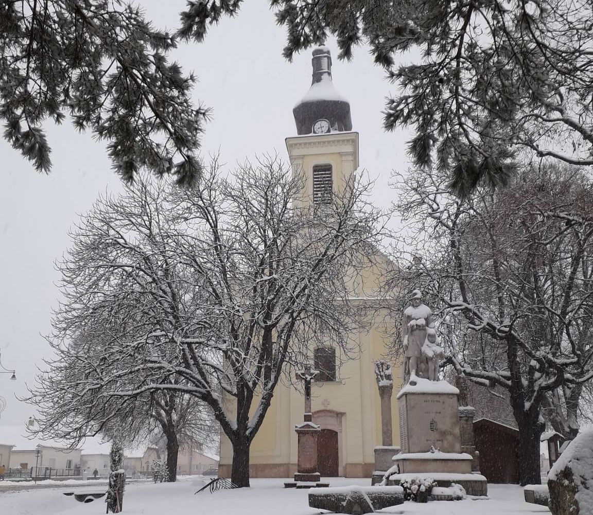 Die Kirche wurde vom Patronatsherrn Josef Esterházy zwischen 1779 und 1783 nach den Plänen von Jakab Fellner im Barockstil erbaut. Nach dem Tod von Fellner beendete Antal Gött den Turm und die Hauptfassade nach seiner eigenen Vorstellung. 1863 erreichte die Kirche ihre heutige Form und Gestaltung. Das Kunstdenkmal hat einen inneren Raum von 455m2 und besteht aus einem Schiff mit seinem speziellen Rundgewölbe und dem geschlossenen Linearchor. Die ältesten Einrichtungen (der Altar, die Kanzel und der Beichtstuhl) wurden im barocken und archaischen Stil angefertigt. Der von Pfeilern gestützte Brüstungschor befindet sich an der Seite des Eingangs, wo auch das barocke Kunstdenkmal, die Orgel zu finden ist, die wahrscheinlich von Franz Xaver Luber 1797 gebaut wurde. Die Wandmalerei der Gewölbe ist schon ein Werk des 20. Jahrhunderts.Im 37 Meter hohen Turm befinden sich drei Glocken. Nach den Ablieferungen im Ersten Weltkrieg wurden alle drei in der Werkstatt des berühmtesten ungarischen Meisters jener Zeit, von László Slezák gegossen. Die kleinste Glocke (100 Pfund, 40 cm) wurde 1926 im heiligen Namen Jesus’ dem Heiligen Franz und der Heiligen Barbara, die mittlere Glocke (300 Pfund, 60 cm) dem Heiligen Florian und dem Heiligen Wendelin, und die größte Glocke (1400 Pfund, 92 cm) im Jahre 1930 der Jungfrau Maria geweiht.Das Haus Gottes musste in den letzten Jahrhunderten öfters renoviert werden, so auch im Jahre 1945, nachdem zwei Bomben schlimmen Schaden verursachten. In den letzten 20 Jahren wurden große Außen- und Innenrestaurierungsarbeiten vorgenommen: 1989 der Austausch der Bänke, 1998 die innere Sanierung, 2003 die Renovierung der Turmkuppel, 2007 die äußere Sanierung und 2008 die Zierpflasterung um die Kirche.Der Schutzpatron unserer Kirche ist der Drachentöter, der heilige Georg, der Märtyrer, der das Böse besiegt. Jedes Jahr wird zu seiner Ehre im Frühling der Heilige Georgtag gefeiert, und im Herbst das Kirmesfest, wobei an die Turmweihung erinnert wird.